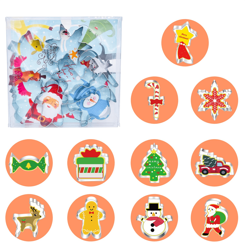 >11different designed cookie cutters : Pickup Truck with Christmas Tree,Snowflake, Snowman, Gingerbread, Santa Claus, Christmas Tree, Candy ,Gift, Reindeer, Shooting Star,Candy Cane